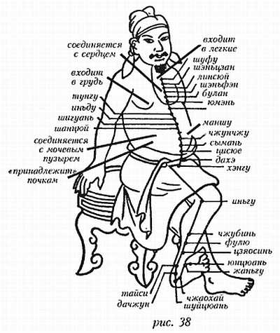 Меридиан начинается под маленьким пальцем ноги, проходит через точки юнцюань, жаньгу и вдоль внутренней лодыжки входит в пятку (рис. 38).