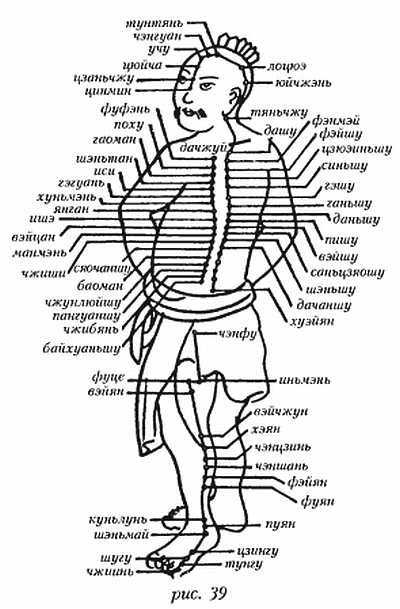 Меридиан начинается в точке цинмин у внутреннего уголка глаза, идет вверх по лбу, проходит точки цзаньчжу, цюйча, учу, чэнгуан, тунтянь и соединяется с точкой байхуэй на макушке (рис. 39).