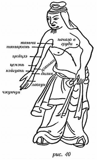 Меридиан начинается в точке гуаньчун безымянного пальца и следует вверх по руке. В точке дачжуй он пересекается с меридианом думай. Далее меридиан проходит вперед в надключичную впадину и, разделяясь, входит в грудь, соединяется с перикардом, пронизывает диафрагму и подключается к «тройному обогревателю» (рис. 41).