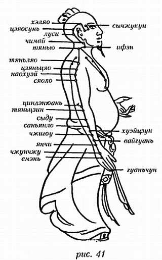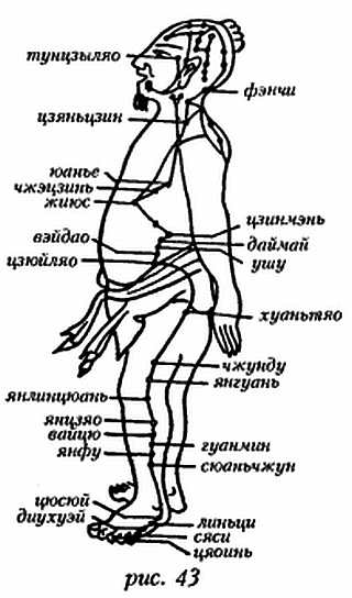 Меридиан начинается в точке туицзыляо, идет вверх по виску, поворачивает назад и опускается в заушную область (рис. 43). Далее он следует по задней стороне шеи до плеча, где в точке дачжуй соединяется с меридианом думай, и вперед, где входит в точку цюэпэнь (в центре ключичной ямки).
