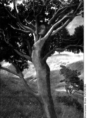 Покореженное сплетение дубовых стволов. Сплошная глыба дерева, темная и мрачная, увенчанная лесом светло-зеленых листьев. Крона, уходящая в небо.