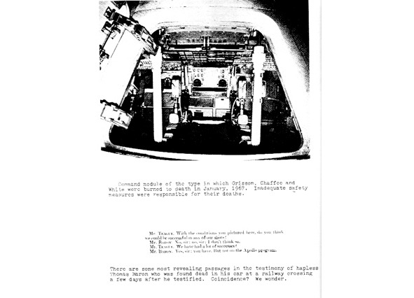 Командный модуль, в котором Гриссом, Чаффи и Уайт сгорели в январе 1967. Были недостаточные меры пожарной безопасности, ответственных лиц за их смерть не нашли.
