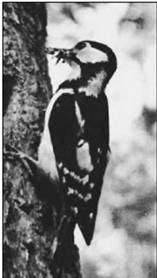 У большого пестрого дятла длинный липкий язык, которым он исследует трещины коры и ловит в извилистых древесных ходах жуков-короедов.