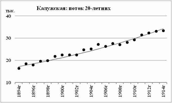 То есть данные потока 20-летних, отображенные графически, позволяют видеть динамику демографического развития региона времен Царской России после отмены крепостного права, на интервале 1894–1914 годов, до начала Германской войны.