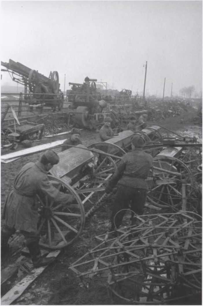 Бойцы советской трофейной команды собирают немецкие сельскохозяйственные машины для отправки в СССР (Восточная Пруссия, железнодорожная станция города Мельзак, 29 марта 1945 года).