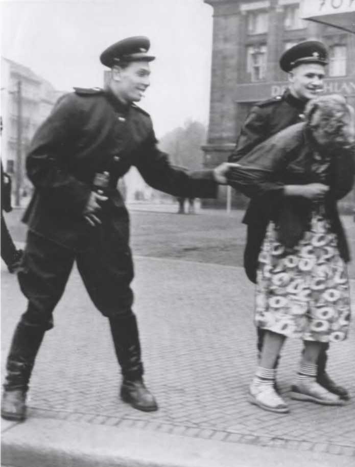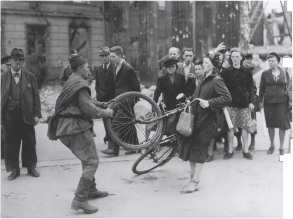 Советский солдат отбирает велосипед у местной жительницы (Австрия, Вена, 1945 год). До 2014 года считалось, что снимок сделан в Берлине, пока женщина с велосипедом, изображенная на фотографии, не опознала на ней себя. Советские пропагандисты объясняли происходящее в кадре иначе. Например, некоторые из них утверждали, что солдат собирался купить велосипед, но имело место взаимное непонимание. Самым экзотическим стало утверждение о том, что на снимке советский солдат помогает женщине отремонтировать велосипед, придавая погнутому колесу правильную форму.