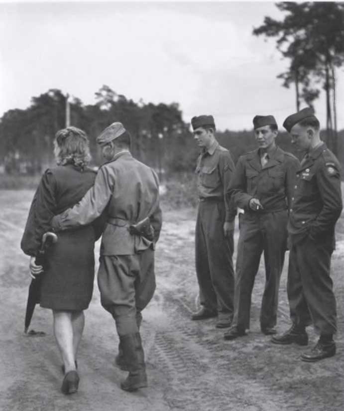 Советский военнослужащий с подругой-немкой проходит мимо солдат американской армии (Берлин, лето 1945 года).