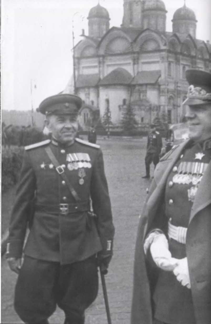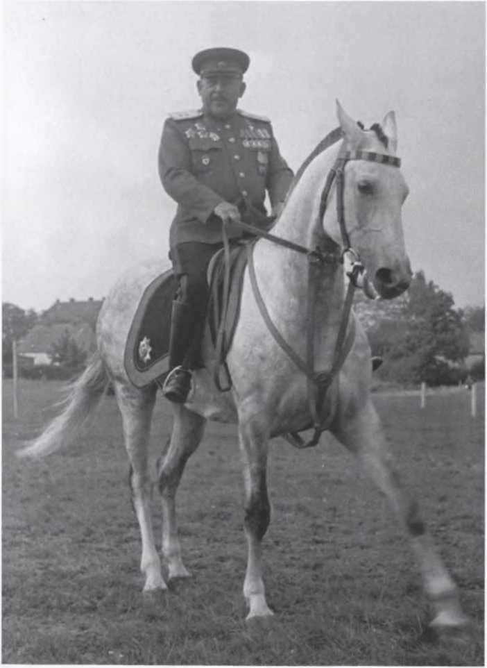 Маршал Советского Союза Жуков (в центре) на территории Кремля перед выходом на Парад Победы 24 июня 1945 года. Слева — генерал-майор Пётр Павлович Зеленский, сопровождавший Жукова верхом во время приема парада. Слева за Зеленским на заднем плане видны кони вороной масти, подготовленные для маршала Рокоссовского, командовавшего парадом, и его адъютанта.