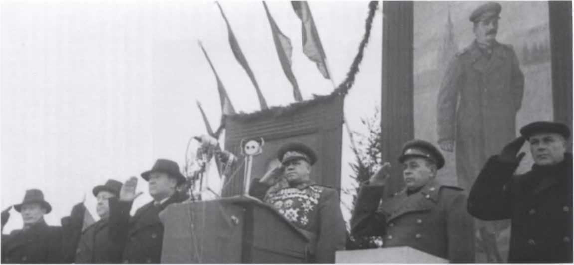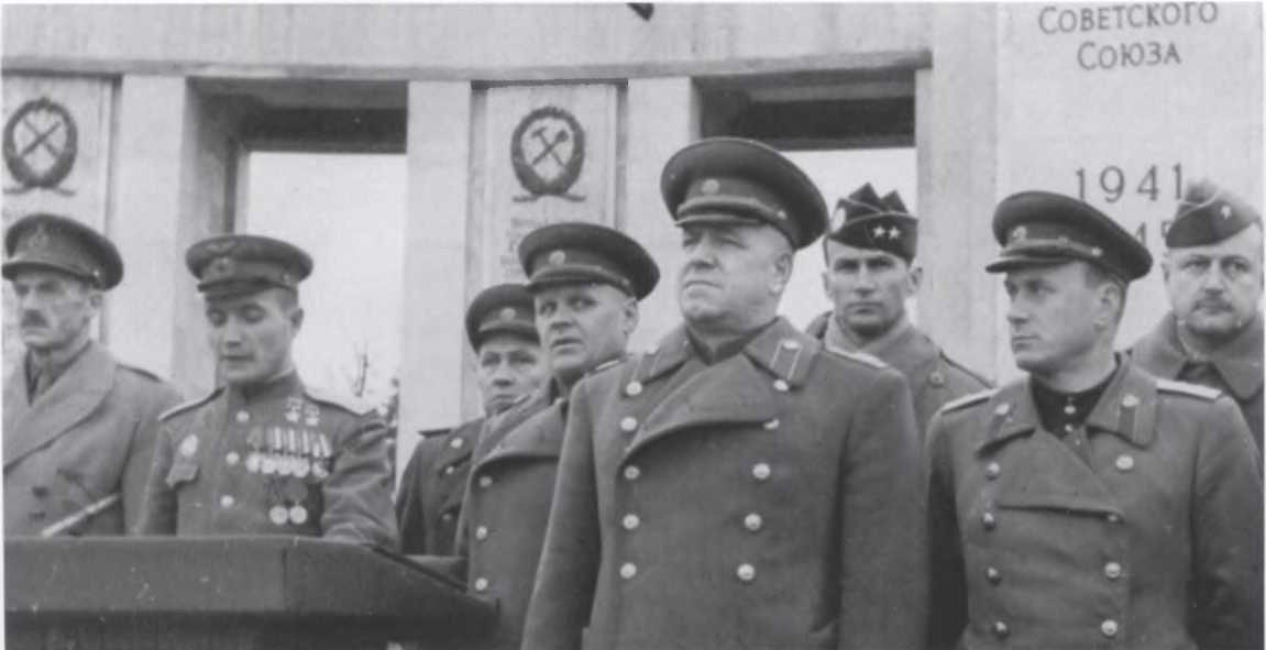 Дважды Герой Советского Союза майор А. Е. Боровых (второй слева) выступает на открытии мемориала павшим советским воинам в Тиргартене; на переднем плане второй справа — маршал Жуков, справа от Жукова — Серов, слева — Телегин. Момент, запечатленный на снимке, очень символичен: слева на Жукова поглядывает его «контролер» по партийной линии Телегин, справа — «контролер» Жукова по линии НКВД Серов.
