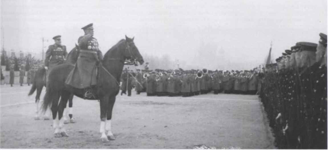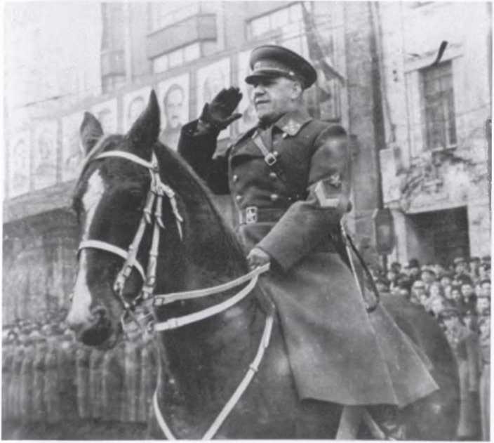 Командующий войсками Одесского военного округа Маршал Советского Союза Жуков приветствует части округа на военном параде в Одессе по случаю 29-й годовщины Октябрьской революции 7 ноября 1946 года. В марте 1946 года Сталин назначил Жукова Главнокомандующим Сухопутными войсками (эта должность была придумана для того, чтобы без шума убрать Жукова из Германии) и заместителем министра Вооруженных Сил СССР. За границу Жукова посылать было нельзя: в Германии он проворовался, под его руководством советские войска в этой стране разложились до полной неспособности воевать, а в Москве для Жукова работы не было. Всего через три месяца, 9 июня 1946 года, после начала расследования «трофейного дела», Жуков был снят с обеих должностей и назначен командующим войсками Одесского военного округа.