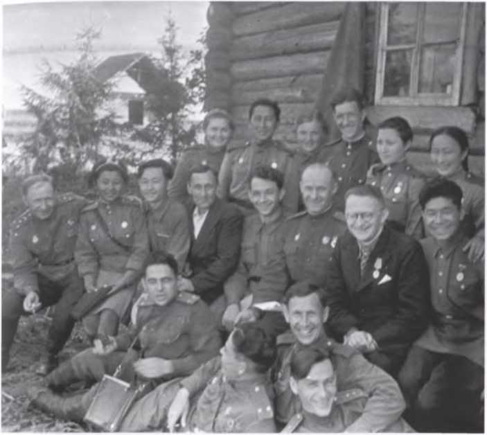 Военный корреспондент и литературный секретарь газеты «Красная звезда» Александр Кривицкий (в среднем ряду второй справа) среди бойцов Панфиловской дивизии (осень 1943 года, Северо-Западный фронт).