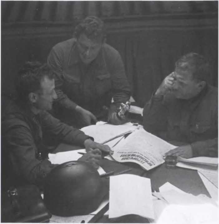 Редактор газеты «Красная звезда» Давид Ортенберг, военный фотокорреспондент М.С. Бернштейн и генеральный секретарь Союза писателей СССР, военный корреспондент газеты «Правда» Владимир Ставский (настоящая фамилия Кирпичников) за чтением газеты «Героическая красноармейская» в расположении 1-й армейской группы (Монголия, река Халхин-Гол, 1939 г.).
