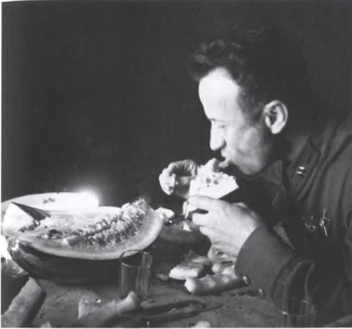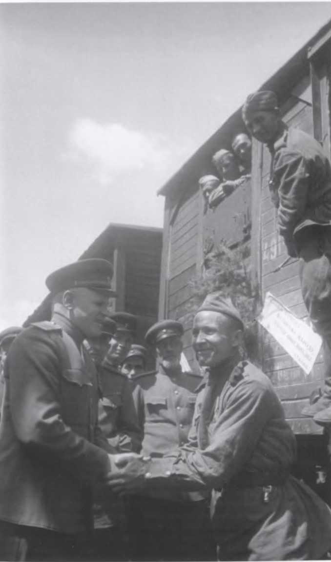 Генерал-лейтенант Телегин прощается с отъезжающими из Берлина на родину бойцами (12 июля 1945 года). Солдатские трофеи умещались в вещмешке, но с ростом воинского звания трофейные аппетиты росли. Воровал Телегин так много, что деяния его стали как бы эталоном, точкой отсчета.