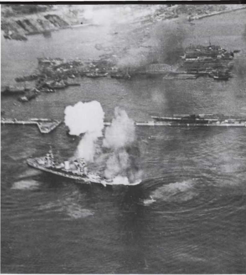 Взрыв на линкоре «Октябрьская революция» в результате попадания бомбы пикирующего бомбардировщика (акватория Финского залива близ Ленинграда, 1941 год; снимок сделан немецким летчиком).