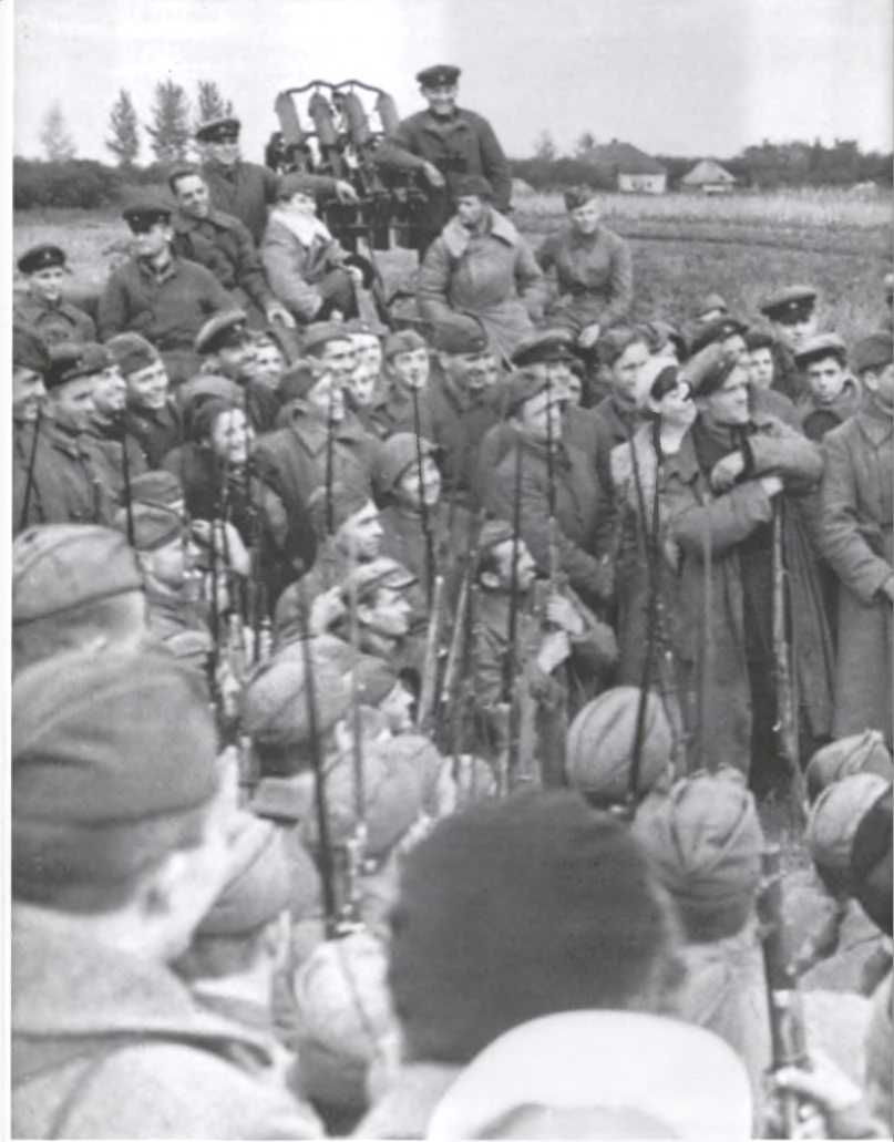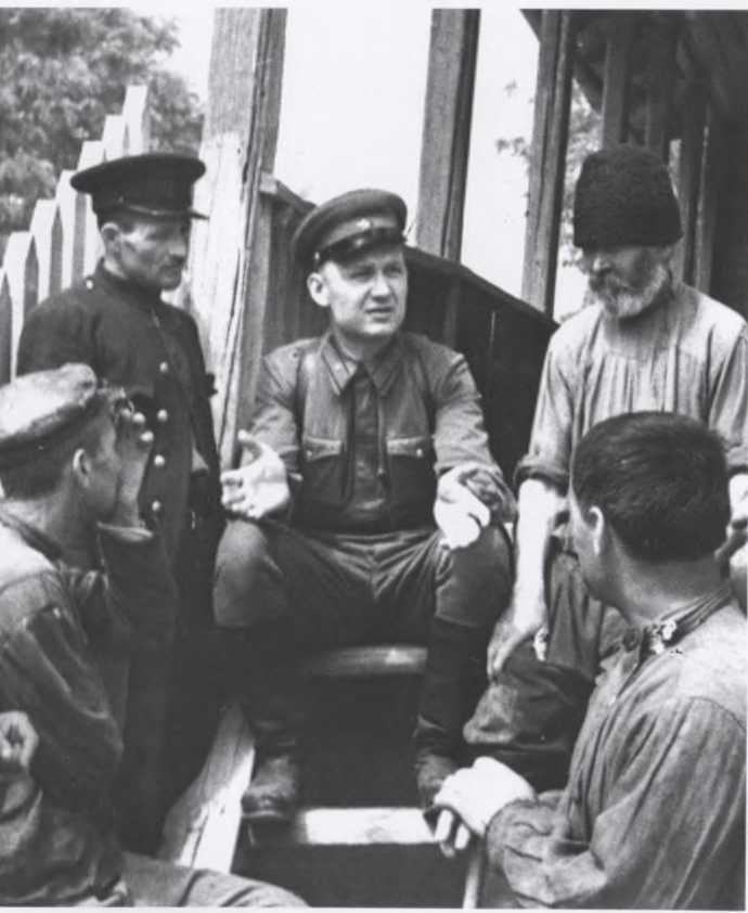 Старший политрук Ф. С. Хакимов рассказывает крестьянам села Каракуй, «освобожденного» Красной Армией, о жизни в СССР (Бессарабия, июль 1940 года).