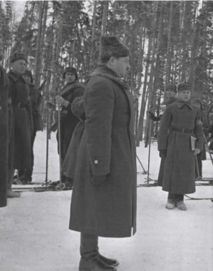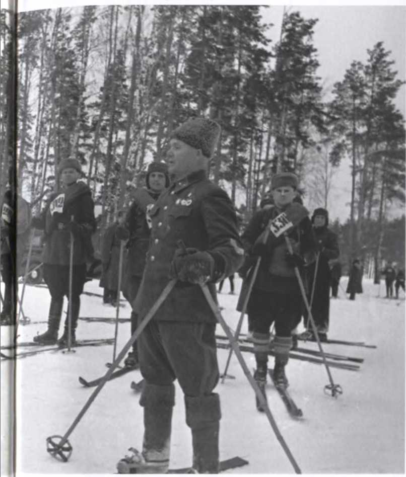 Командующий войсками Московского военного округа генерал армии Иван Владимирович Тюленев (слева) принимает рапорт командира 1-й Пролетарской Московской мотострелковой дивизии Дмитрия Даниловича Лелюшенко перед началом всеармейского лыжного кросса (февраль 1941 г.).