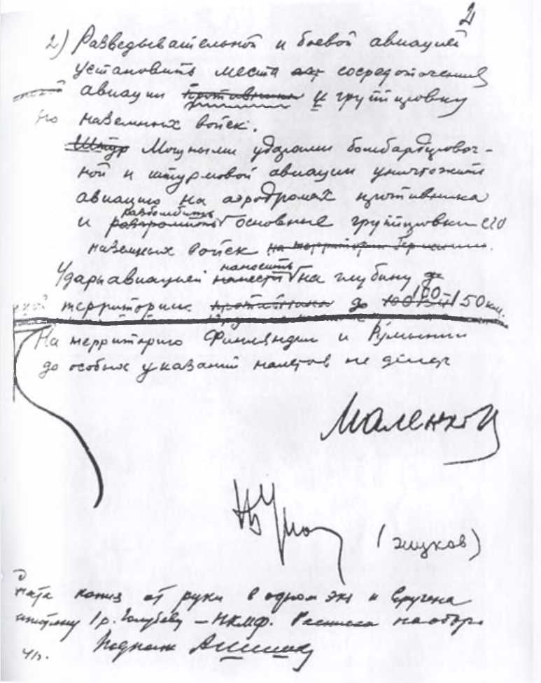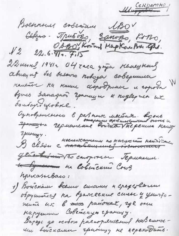Черновик Директивы № 2, опубликованный в «Военно-историческом журнале», свидетельствует о том, что документ составлялся экспромтом, в состоянии, близком к истерическому (обратите внимание на внесенную в документ правку). Директива № 2 была самым первым документом, который высшее руководство страны направило войскам Красной Армии с момента начала войны. Текст документа меньше всего напоминает боевой приказ: произвольные цифры, противоречивые указания, неуместная риторика. До сих пор никто из историков, придерживающихся версии о нежелании Советского Союза нападать на Германию, не объяснил, почему после нападения противника руководство Красной Армии (Генеральный штаб которой, по словам Жукова, интенсивно работал в предвоенные годы) не ввело в действие планы обороны страны, которые обязано было подготовить ввиду возможной агрессии. Директива и обстоятельства ее составления обсуждаются в главе 13 (стр. 182).