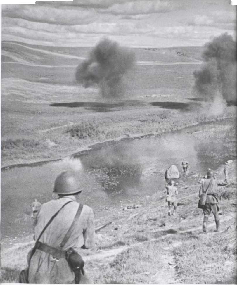 Бойцы 375-й стрелковой дивизии с боем переправляются через водный рубеж под Ржевом в августе 1942 года. С января по август 1942 года 5 армий Калининского фронта и 10 армий Западного фронта рвались на Ржев и Сычёвку, проводя непрерывные бестолковые наступательные операции, каждая из которых завершилась провалом. Жуков был не только командующим Западным фронтом, но и главнокомандующим Западным направлением, в состав которого входили Западный и Калининский фронты. Мясорубку под Ржевом под руководством Жукова помнили все фронтовики.