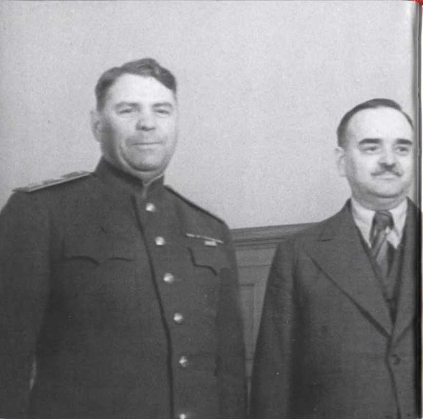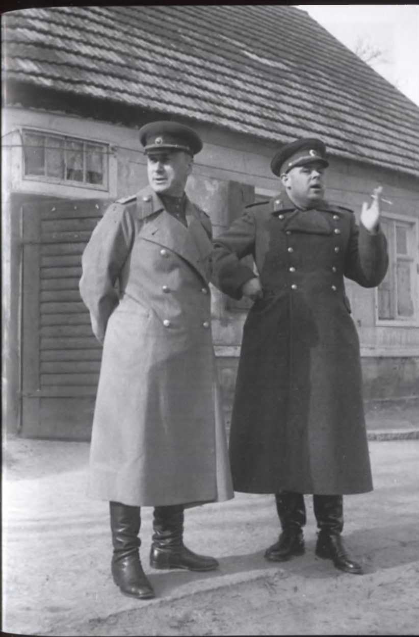 Уполномоченный НКВД СССР по 1-му Белорусскому фронту Иван Серов (слева) и начальник Управления контрразведки СМЕРШ 1-го Белорусского фронта генерал-лейтенант Александр Вадис. Вероятно, снимок сделан в берлинском районе Карлсхорст 8 мая 1945, в день подписания капитуляции Германии. 6 июня 1945 года была организована Советская военная администрация в Германии (СВАГ) во главе с Жуковым; Серов был назначен заместителем Жукова по делам гражданской администрации и уполномоченным НКВД в Германии, он руководил назначением бургомистров немецких городов и районов, сельских старост, начальников полиции, прокуроров и судей, а также продолжал присматривать за Жуковым по линии государственной безопасности.