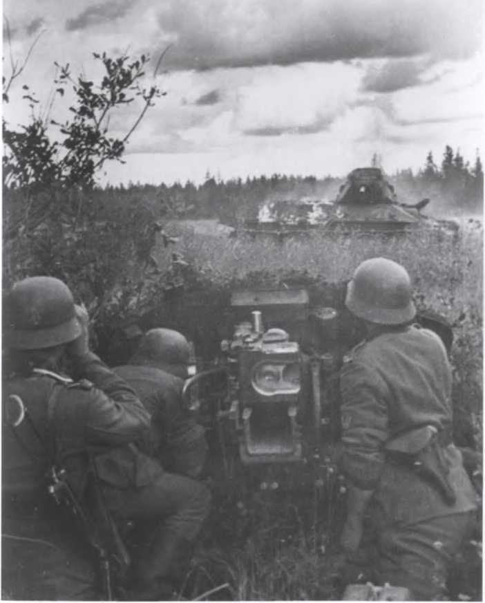 Расчет германской противотанковой пушки Рак 35/36 только что подбил из засады советский танк Т-34 (сентябрь 1941 года). В фотоприложении к новому изданию книги Виктора Суворова «Беру свои слова обратно»(М.: Издательство «Добрая книга», 2013. Вклейка 3. С. 32) мы опубликовали другой снимок этого драматичного момента, сделанный чуть раньше, сразу после выстрела из орудия. Готовя подборку фотографий для этой книги, мы нашли в одном из архивов этот снимок, сделанный немного позже, и теперь нам известен результат поединка: танк загорелся и экипаж, вероятно, был вынужден покинуть его (крышки люков открыты), не успев произвести ответный выстрел.