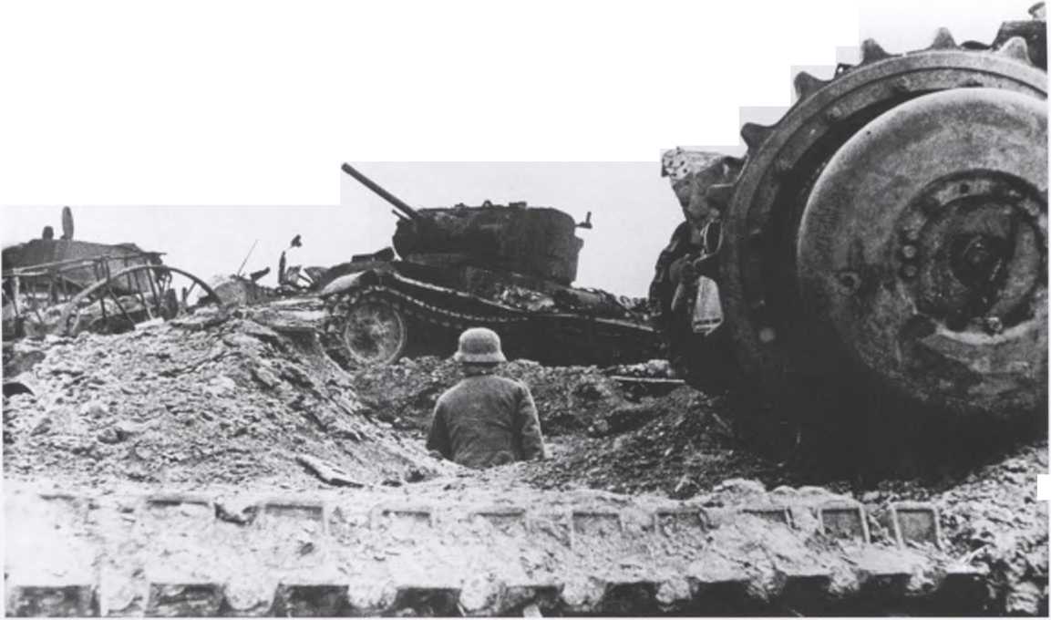 Танк Т-34 (слева) и английские легкие танки Мк. Ш «Валентайн» (поставлялись в СССР по программе ленд-лиза), подбитые в районе Ржева (1942 г.). На переднем плане под прикрытием одного из танков немецкий солдат оборудовал позицию и готовится к отражению следующей атаки.