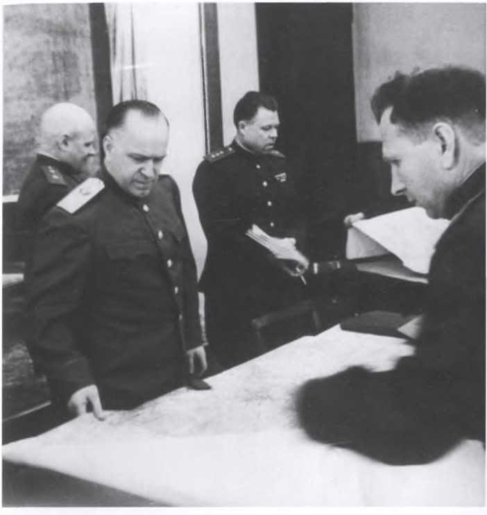 Военный Совет 1-го Белорусского фронта во время подготовки или проведения Берлинской наступательной операции (слева направо): член Военного Совета генерал-майор Константин Фёдорович Телегин, командующий фронтом Маршал Советского Союза Г. К. Жуков, начальник штаба генерал-полковник Михаил Сергеевич Малинин и генерал-адъютант Жукова по особо важным оперативным делам генерал-лейтенант Иван Семёнович Варенников (апрель 1945 года). Сталин несколько раз безуспешно пытался использовать Жукова в качестве координатора действий нескольких фронтов и в итоге был вынужден координировать их действия лично, из Кремля, а Жукова понизил в должности и поставил командовать одним фронтом, Первым Белорусским. На этом посту Жуков навеки опозорил свое имя тупым, бездарным, преступным проведением Берлинской операции. Штурм Берлина показал, что за четыре года войны Жуков так ничему и не научился.