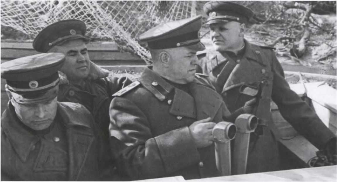 Советские военачальники на командном пункте близ Зееловских высот. Слева направо: командующий артиллерией 1-го Белорусского фронта генерал-полковник В. И. Казаков, начальник тыла фронта генерал-полковник Н. А. Антипенко, командующий фронтом маршал Г. К. Жуков, член Военного совета фронта генерал-полковник К. Ф. Телегин (апрель 1945 г.).