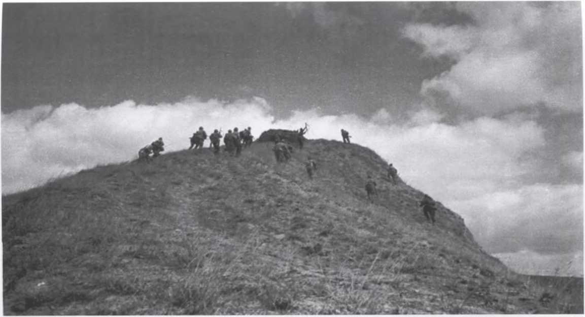 Красноармейцы ведут наступление на Зееловские высоты (около 90 км к востоку от Берлина, 16–19 апреля 1945 года). Здесь немцы организовали глубоко эшелонированную оборону, оказывая ожесточённое сопротивление советским стрелковым соединениям, и Жуков ввел в сражение 1-ю и 2-ю гвардейские танковые армии, что не было предусмотрено планом операции.