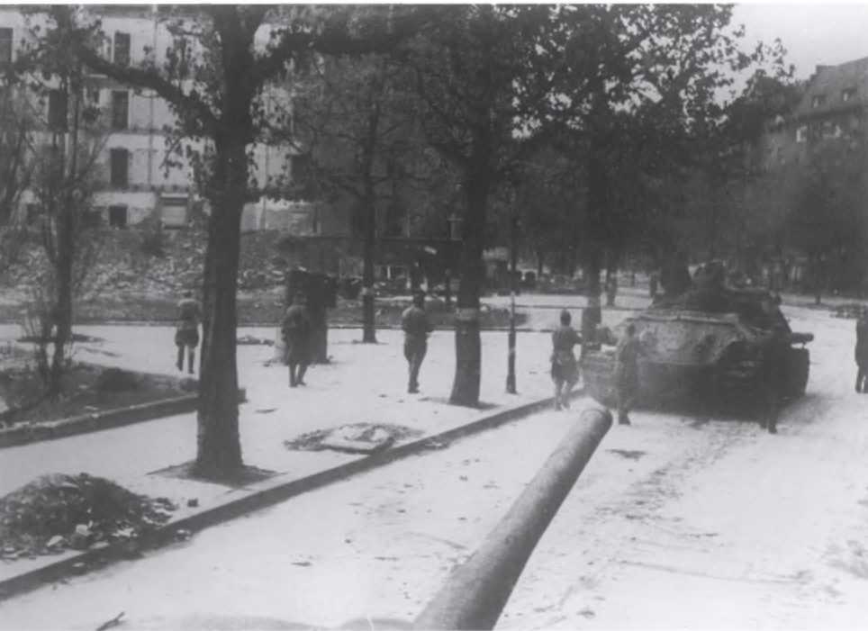 Бойцы советского штурмового отряда продвигаются к центру Берлина по Берлинер-штрассе при поддержке самоходных артиллерийских установок СУ-100 (конец апреля 1945 г.).