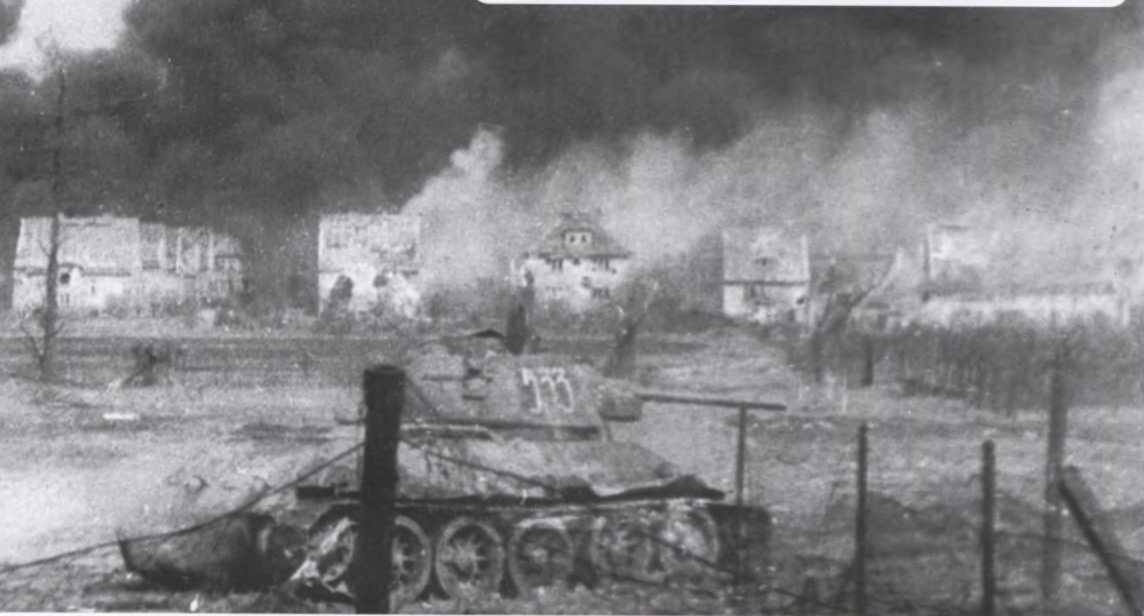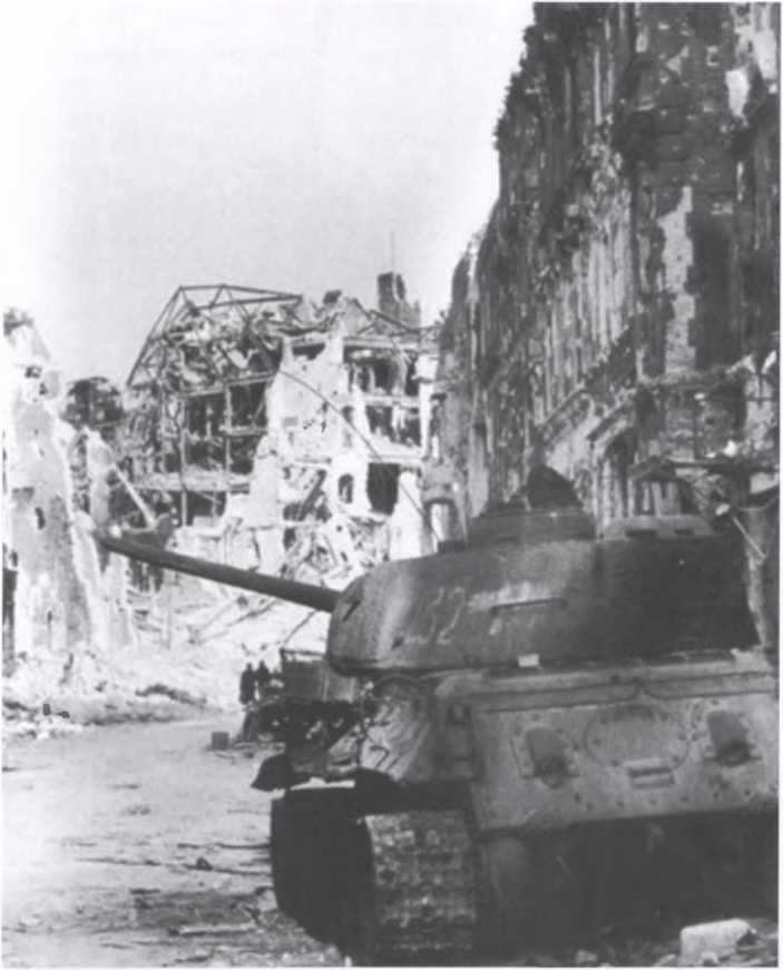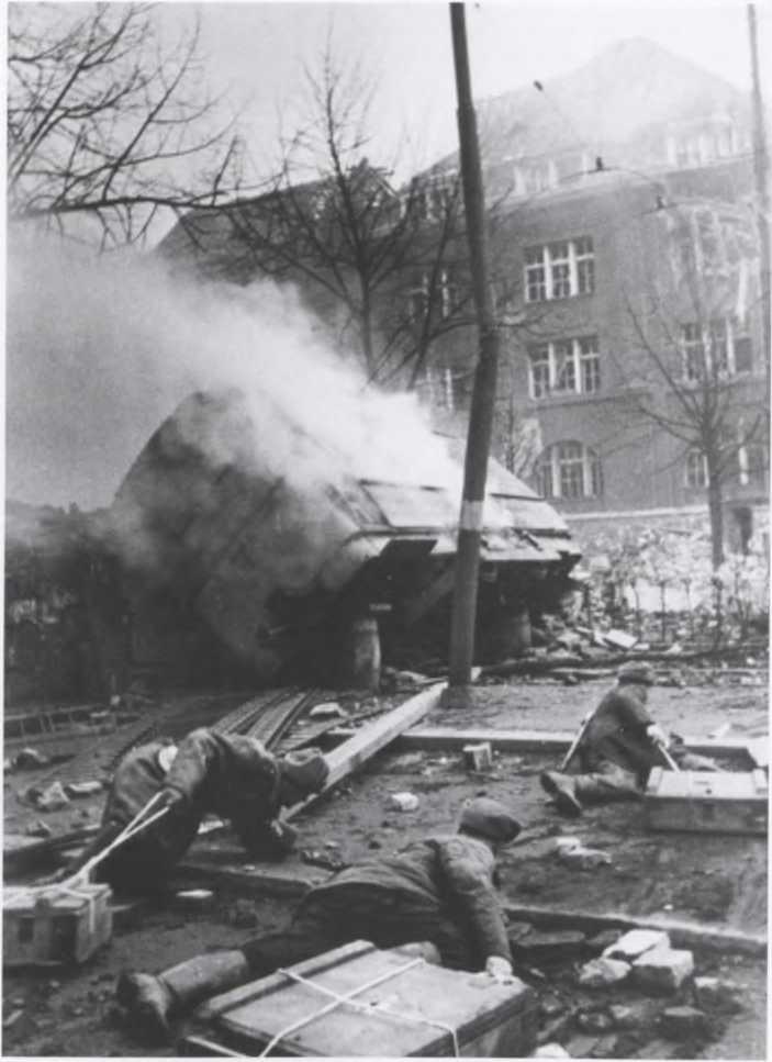 Снимок одной из улиц Берлина во время боя; на переднем плане — Ц подбитый советский танк Т-34 (конец апреля — начало мая 1945 г.).