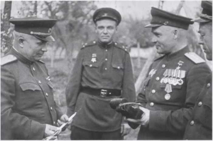 Командующий 4-й танковой армией 1-го Украинского фронта генерал-полковник Дмитрий Лелюшенко вручает члену военного совета фронта Никите Хрущёву трофейную шпагу, принадлежавшую немецкому генералу, командиру 17-й танковой дивизии (18 мая 1944 года).
