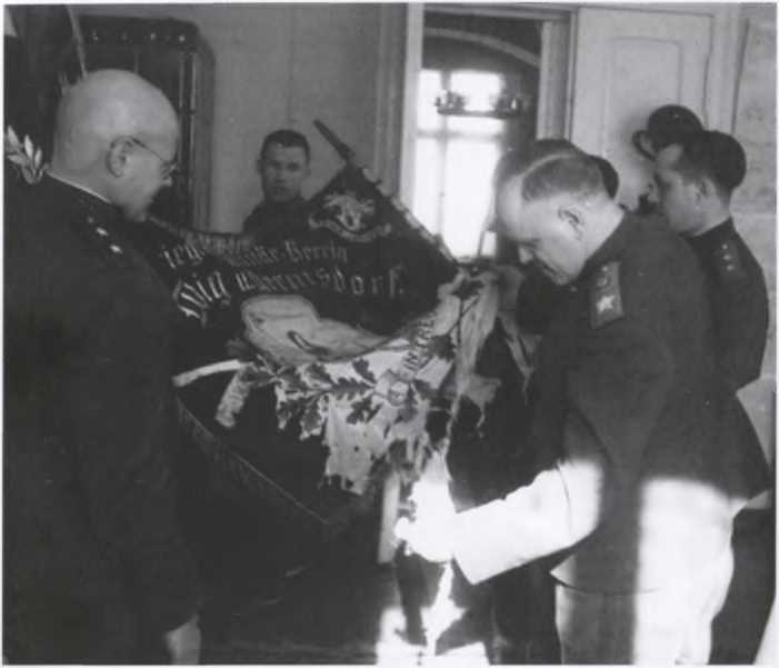 Главнокомандующий Группой советских войск в Германии (ГСВГ) и Главноначальствующий советской военной администрации Жуков и член Военного Совета ГСВГ Телегин рассматривают трофейное германское знамя (Германия, июль-август 1945 года),