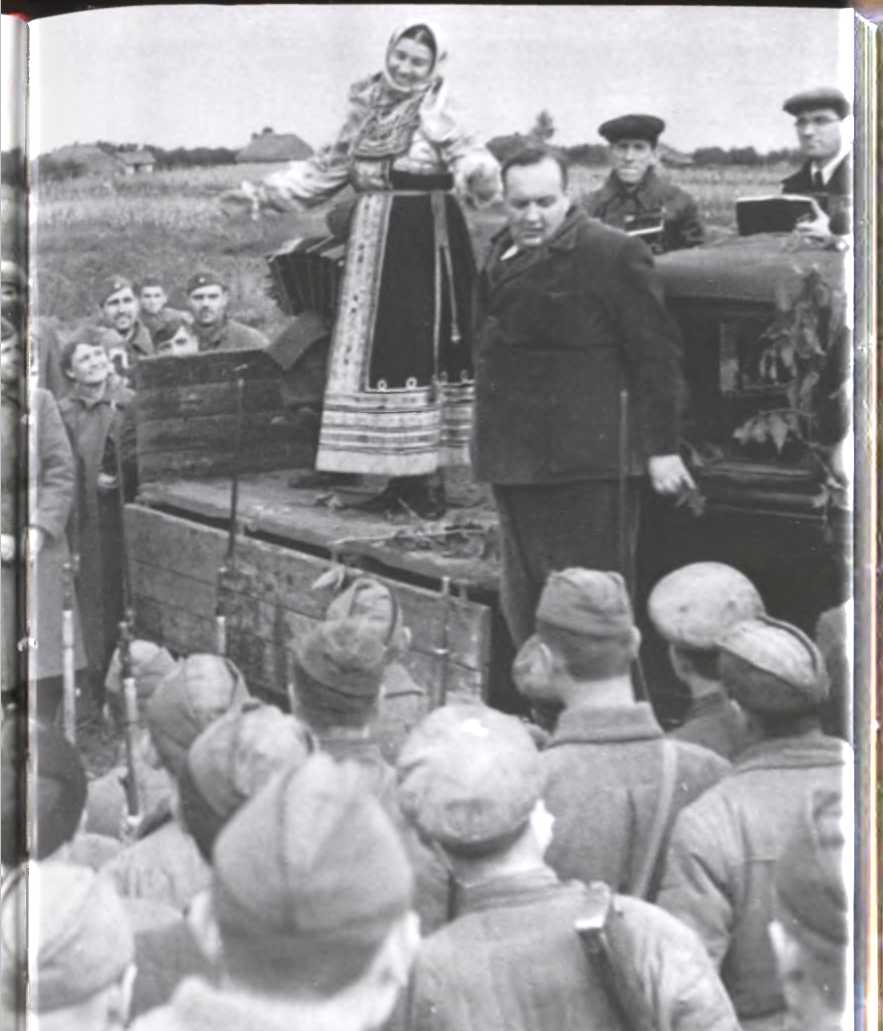 Исполнительница русских народных песен Лидия Русланова выступает перед бойцами действующей армии в составе фронтовой бригады московских артистов (Южный фронт, октябрь 1941 года). Справа от нее стоит известный советский конферансье Михаил Гаркави, третий муж Руслановой, В апреле 1942 года, выступая с концертами в Спас-Нуделе, под Волоколамском, перед бойцами и командирами 2-го гвардейского кавалерийского корпуса.