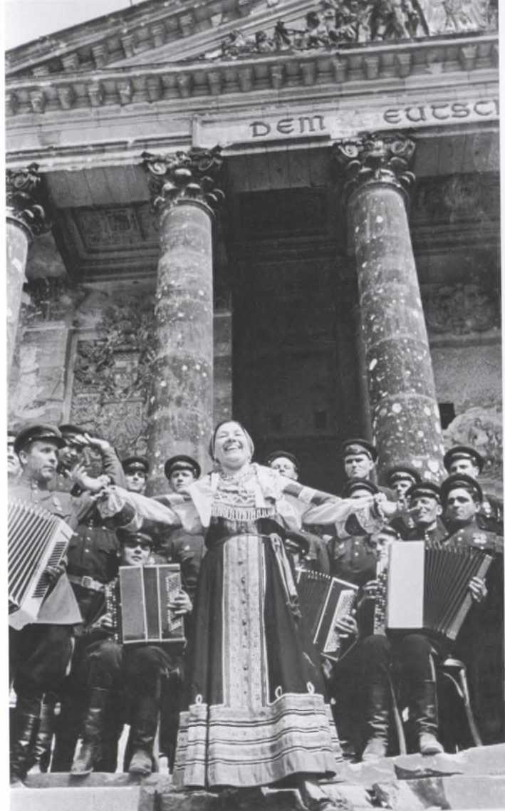 Лидия Русланова вместе с казачьим ансамблем песни и пляски Михаила Туганова выступает перед советскими воинами на ступенях Рейхстага 2 мая 1945 года. Бои за рейхстаг продолжались весь день 1 мая, и только в ночь на 2 мая гарнизон рейхстага капитулировал. Очевидцы утверждают, что концерт продолжался до поздней ночи, а после него Русланова углем поставила свою подпись на одной из колонн Рейхстага.