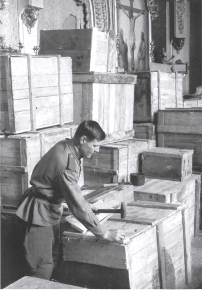Красноармеец упаковывает в ящики культурные ценности для отправки из Германии в СССР (город Хайльсберг, апрель 1945 года). Архивная аннотация к этой фотографии утверждает, что в ящиках находятся книги из научной библиотеки Украинской Академии Наук, вывезенные оккупантами в Германию, но эта информация вызывает сомнение: ящики такого объема, наполненные книгами, были бы просто неподъемными.