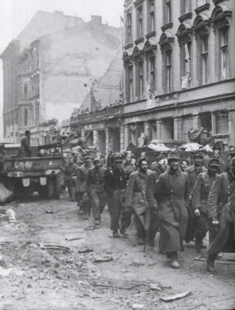 Колонна пленных немцев проходит по одной из улиц Берлина мимо советских грузовиков, груженых трофеями (конец апреля — начало мая 1945 г.).