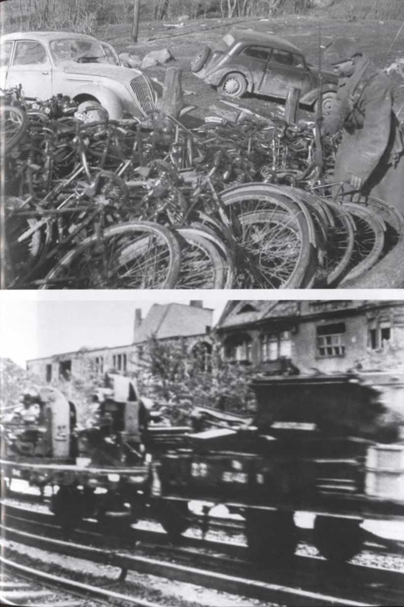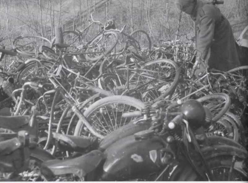 Красноармейцы среди трофейных велосипедов и автомобилей (Германия, 1945 год).