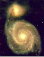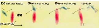 Столкновение галактик – медленный процесс. Чтобы его видеть, недостаточно обладать только телескопом. Компьютеры могут моделировать это явление, варьируя массы, скорости, характер взаимодействия – касательное соприкосновение или же фронтальный удар. Для примера возьмем галактику М51, названную «Огненное колесо». Снимок показывает, как проходит мимо нее карликовая галактика NGC 5195. Обе при этом сильно искажены, но еще отдалены одна от другой, хотя по снимку кажутся соединенными (снимок и схема).