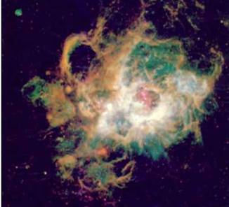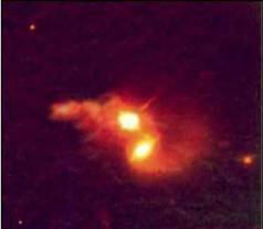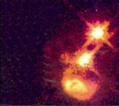 Сто миллионов лет длится слияние двух спиральных галактик – это начальная стадия образования эллиптической системы. Слияние сопровождается рождением звезд-гигантов, которые взрываются как сверхновые.