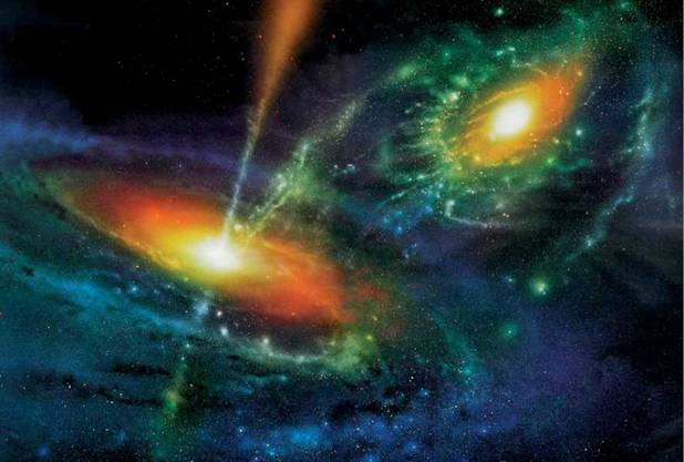В последние годы астрономы наблюдают все новые и новые примеры столкновений между галактикой, принадлежащей квазару, и соседними галактиками. Приливные силы толкают огромные массы газа в черную дыру квазара – «кормят» его.