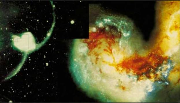 Галактика NGC 7252. Внутри ее видны шаровидное скопление и маленькое – всего 10000 световых лет в диаметре – спиральное образование (внизу слева). Это свидетельства того, что NGC 7252 произошла от слияния с какой-то другой галактикой.