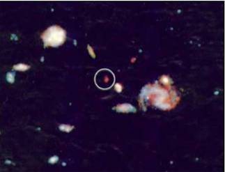 Самый удаленный от нас источник света. Телескоп Хаббла 10 дней подряд фотографировал этот маленький участок неба в созвездии Большой Медведицы. На снимке появилось пятнышко – это галактика, родившаяся, когда возраст Вселенной составлял лишь одну десятую часть ее теперешнего возраста – от первоначального взрыва до наших дней. Слабый свет от этой галактики можно сравнить с горящей сигаретой, отнесенной на расстояние орбиты Луны (объект в центре снимка, в белом кружке).