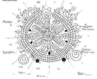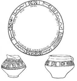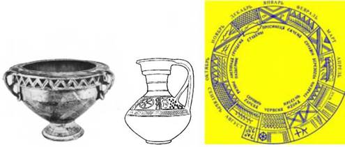 Славянские сосуды-календари. IV век. Слева – сосуд для новогодних гаданий. Лепесовка (Украина). Поверх волнистой линии изображены. символы 12 месяцев. В центре – кувшин из Ромашкова (Киевщина). Справа – сводная схема календарей, изображенных на двух этих сосудах.