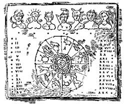 Рисунок, выбитый на старинном каменном календаре римлян. В верхнем ряду изображены боги, которым посвящены дни недели: Сатурн – суббота, Солнце – воскресенье, Луна – понедельник, Марс – вторник, Меркурий – среда, Юпитер – четверг, Венера – пятница. В центре календаря -римский зодиак, справа и слева от него – латинские обозначения чисел месяца.