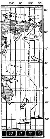 Морские суда, идущие по Тихому океану с востока на запад, при пересечении этой линии пропускают в календаре один день и считают, например, четверг после полуночи 31 декабря 1998 года сразу субботой 2 января 1999 года. На судне, идущем в противоположном направлении, наоборот, дважды, считают одну и ту же дату – число, месяц и день недели. Сплошными полужирными линиями на карте показаны часовые пояса: 10, 11, 12, 13.
