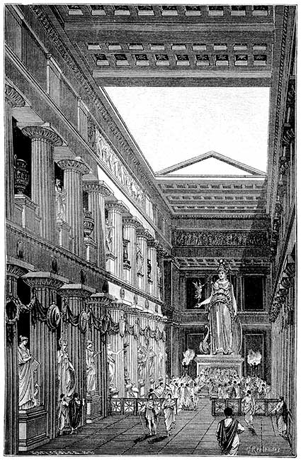 Рис. 173. Реконструкция внутреннего святилища Парфенона со статуей Афины, работы «античного» Фидия. Реконструкция на основе уцелевших развалин выполнена Г. Рэлендером. Взято из [304], т. 1, с. 152.