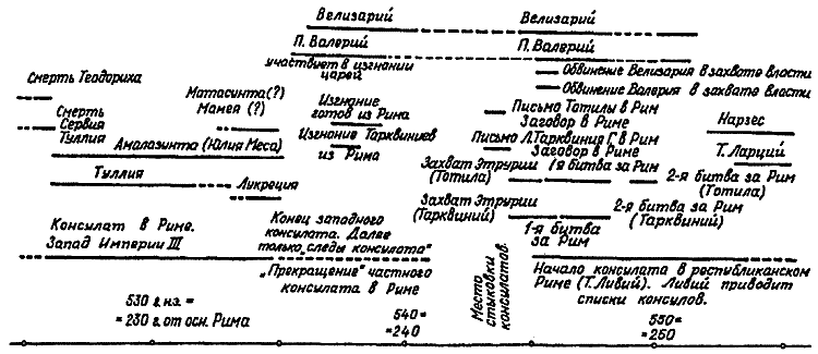 1) В конце 548 — начале 549 года н. э. Велизария отзывают из Италии, и он окончательно сходит со сцены Готской войны. Налицо очень хорошее согласование дат: 550 год («античная» тарквинийская дата, после сдвига) и 548–549 годы (средневековая «готская»).