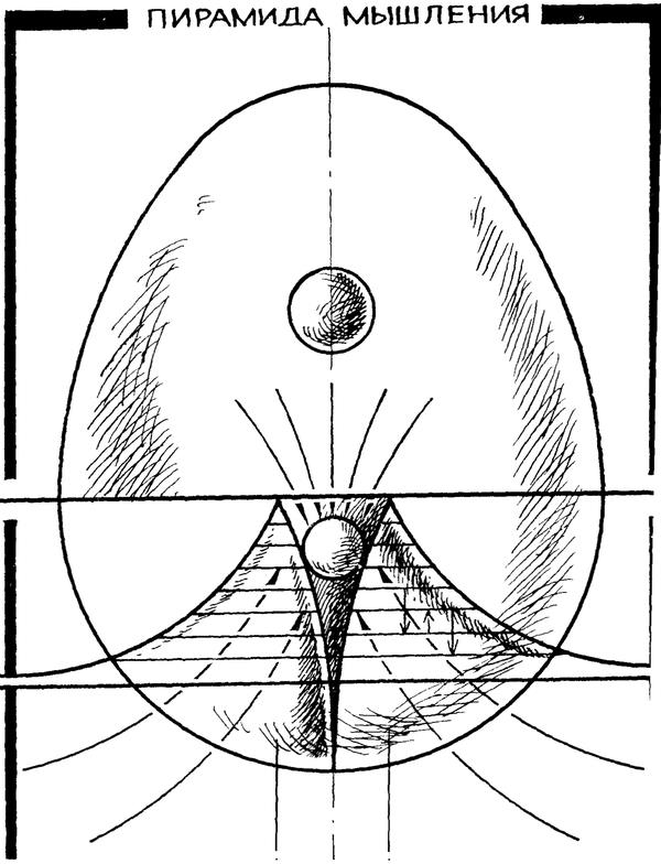 Когда Пирамида работает, то активизируются мышление, чувствование, память, предчувствование (память вперед, она же интуиция). Надо заметить, что для всей Пирамиды и внепирамидальных областей категория «образ» является сверхуниверсальной, ибо образ есть у всего, даже у Господа Бога и даже у самого себя. (Между прочим, крайне интересная творческая задача для художника, вне зависимости от области искусства, — это нарисование Образа Вообще; ближе всего к решению этой задачи мгновениями подходит самое универсальное из искусств, — музыка.) Но мышление, однако, нередко лишь воссоздает в виде своеобразного графического конспекта перипетии более глубокого процесса, текущего сплошным потоком там, на этаж ниже, — потока эмоций.