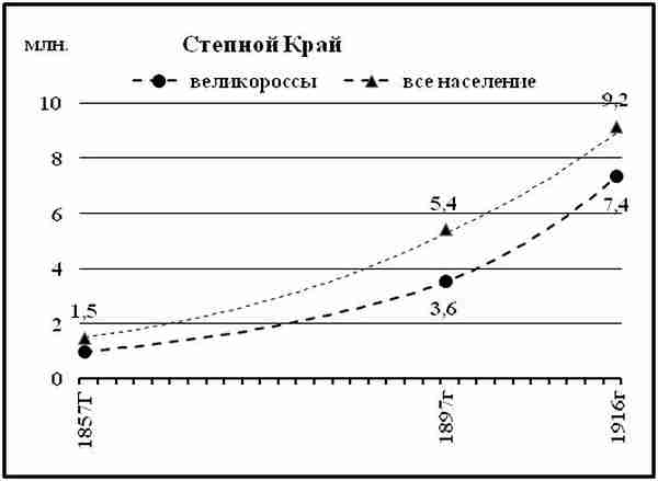 Русские в Степном Крае составляли две трети всего населения. Так что роль Степного Края в демографическом развитии великороссов накануне падения Царства Романовых была определяющей.