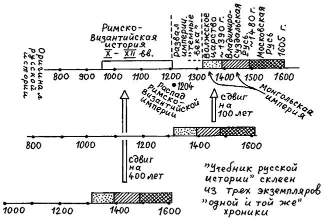 Рис. 1(3). К оригиналу, состоящему из римско-византийской хроники 10–12 вв. и русской хроники 14–16 вв. (разделенных 100-летним периодом хаоса, см. рис. 1(2)), была дважды «подклеена» русская хроника 14–16 вв., сдвинутая на 100 и 400 лет вниз.